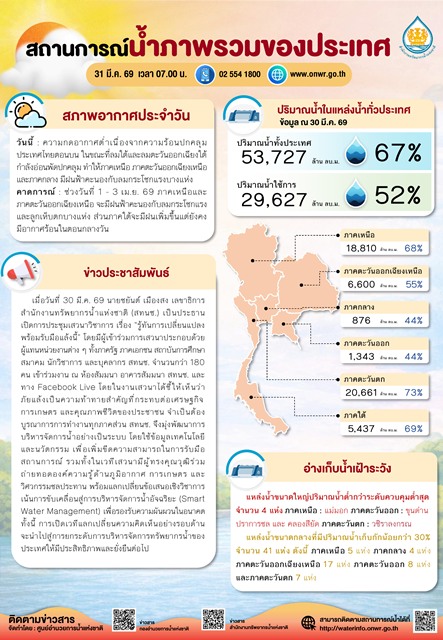 5. ข่าวประชาสัมพันธ์ : เมื่อวันที่ 30 มี.ค. 69 นายชยันต์ เมืองสง เลขาธิการสำนักงานทรัพยากรน้ำแห่งชาติ (สทนช.) เป็นประธานเปิดการประชุมเสวนาวิชาการ เรื่อง “รู้ทันการเปลี่ยนแปลง พร้อมรับมือแล้งนี้” โดยมีผู้เข้าร่วมการเสวนาประกอบด้วย ผู้แทนหน่วยงานต่าง ๆ ทั้งภาครัฐ ภาคเอกชน สถาบันการศึกษา สมาคม นักวิชาการ และบุคลากร สทนช. จำนวนกว่า 180 คน เข้าร่วมงาน ณ ห้องสัมมนา อาคารสัมมนา สทนช. และทาง Facebook Live โดยในงานเสวนาได้ชี้ให้เห็นว่า ภัยแล้งเป็นความท้าทายสำคัญที่กระทบต่อเศรษฐกิจ การเกษตร และคุณภาพชีวิตของประชาชน จำเป็นต้องบูรณาการการทำงานทุกภาคส่วน สทนช. จึงมุ่งพัฒนาการบริหารจัดการน้ำอย่างเป็นระบบ โดยใช้ข้อมูลเทคโนโลยี และนวัตกรรม เพื่อเพิ่มขีดความสามารถในการรับมือสถานการณ์ รวมทั้งในเวทีเสวนามีผู้ทรงคุณวุฒิร่วมถ่ายทอดองค์ความรู้ด้านภูมิอากาศ การเกษตร และวิศวกรรมชลประทาน พร้อมแลกเปลี่ยนข้อเสนอเชิงวิชาการเน้นการขับเคลื่อนสู่การบริหารจัดการน้ำอัจฉริยะ (Smart Water Management) เพื่อรองรับความผันผวนในอนาคต ทั้งนี้ การเปิดเวทีแลกเปลี่ยนความคิดเห็นอย่างรอบด้านจะนำไปสู่การยกระดับการบริหารจัดการทรัพยากรน้ำของประเทศให้มีประสิทธิภาพและยั่งยืนต่อไป