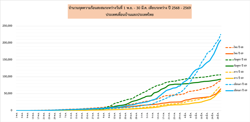นอกจากนี้ ยังมีการประสานงานกับประเทศเพื่อนบ้านอย่างใกล้ชิด ผ่านช่องทาง WhatsApp Hotline ไปยังอธิบดีของเมียนมา และ สปป.ลาว อย่างต่อเนื่อง ควบคู่กับการประสานกรมเอเชียตะวันออก เพื่อใช้กลไกทางการทูตในการขอความร่วมมือจากหน่วยงานที่เกี่ยวข้องของประเทศเพื่อนบ้านให้เร่งลดจุดความร้อนโดยด่วน