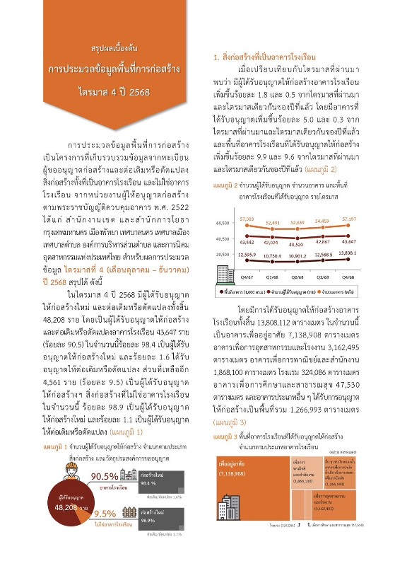 ดร.เอกพงษ์ หริ่มเจริญ ผู้อำนวยการสำนักงานสถิติแห่งชาติ เปิดเผยว่า การประมวลข้อมูลพื้นที่การก่อสร้างเป็นโครงการที่เก็บรวบรวมข้อมูลจากทะเบียนผู้ขออนุญาตก่อสร้าง และต่อเติมหรือดัดแปลงสิ่งก่อสร้าง ทั้งที่เป็นอาคารโรงเรือน และไม่ใช่อาคารโรงเรือน จากหน่วยงานผู้ให้อนุญาตก่อสร้างตามพระราชบัญญัติควบคุมอาคาร พ.ศ. 2522 ได้แก่ สำนักงานเขต และสำนักการโยธา กรุงเทพมหานคร เมืองพัทยา เทศบาลนคร เทศบาลเมือง เทศบาลตำบล องค์การบริหารส่วนตำบล และการนิคมอุตสาหกรรมแห่งประเทศไทย สำหรับผลการประมวลข้อมูล ไตรมาสที่ 4 (เดือนตุลาคม – ธันวาคม) ปี 2568 สรุปได้ดังนี้