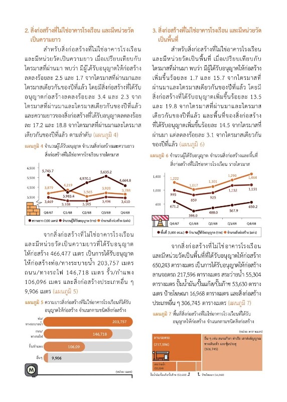 สำหรับสิ่งก่อสร้างที่ไม่ใช่อาคารโรงเรือน และมีหน่วยวัดเป็นความยาวที่ได้รับอนุญาตให้ก่อสร้าง 466,477 เมตร เป็นการได้รับอนุญาตให้ก่อสร้างท่อ/ทางระบายน้ำ 203,757 เมตร ถนน/ทางรถไฟ 146,718 เมตร รั้ว/กำแพง 106,096 เมตร และสิ่งก่อสร้างประเภทอื่นๆ 9,906 เมตร