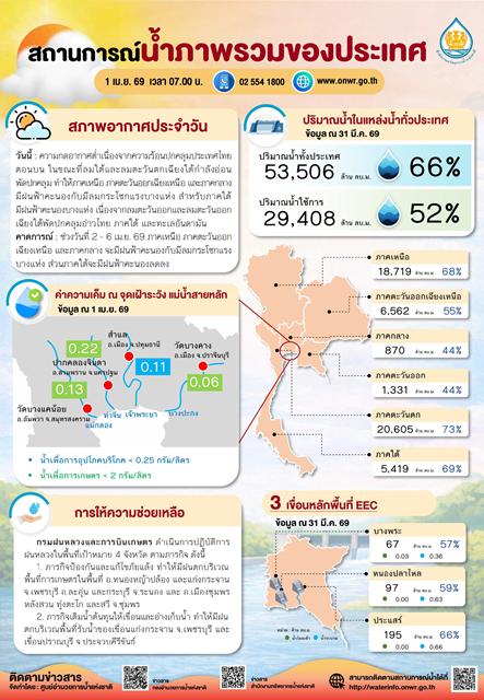 สรุปสถานการณ์น้ำภาพรวมของประเทศ วันที่ 1 เม.ย. 69 เวลา 7.00 น.