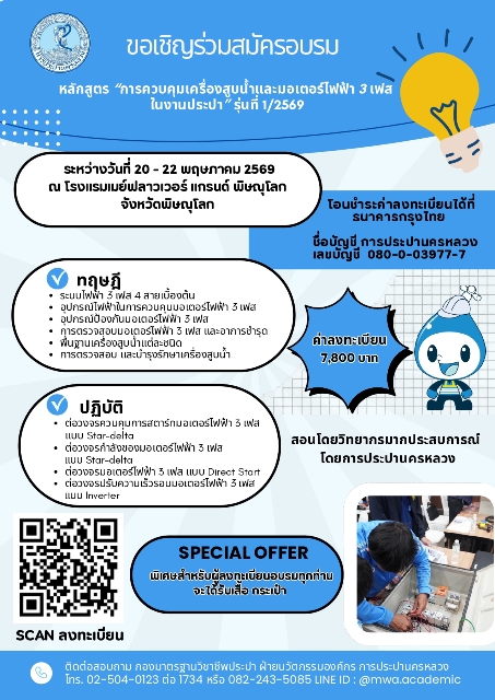 กปน. เชิญชวนสมัครอบรม “การควบคุมเครื่องสูบน้ำและมอเตอร์ไฟฟ้า 3 เฟส ในงานประปา” รุ่นที่ 1/2569 ณ โรงแรมเมย์ฟลาวเวอร์ แกรนด์ พิษณุโลก
