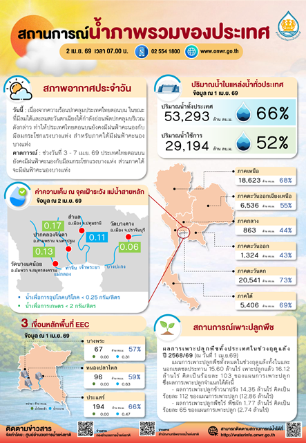 สรุปสถานการณ์น้ำภาพรวมของประเทศ วันที่ 2 เม.ย. 69 เวลา 7.00 น.