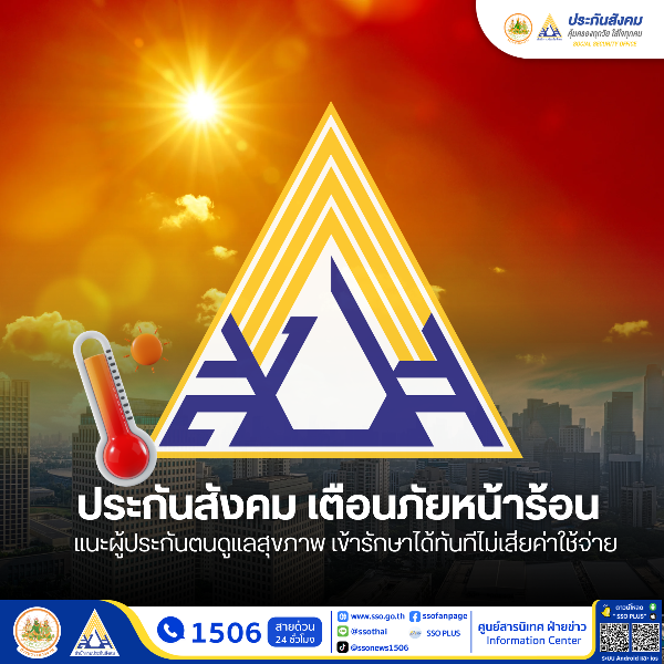 สำนักงานประกันสังคม เตือนผู้ประกันตนให้เฝ้าระวังโรคที่มากับฤดูร้อน หลังประเทศไทยเข้าสู่ช่วงอากาศร้อนจัด ซึ่งส่งผลให้ประชาชน โดยเฉพาะลูกจ้างและผู้ประกันตน มีความเสี่ยงเจ็บป่วยเพิ่มขึ้นจากอาหารและน้ำดื่มที่ปนเปื้อนเชื้อโรค ซึ่งสามารถเจริญเติบโตและแพร่กระจายได้อย่างรวดเร็วในสภาพอากาศดังกล่าว