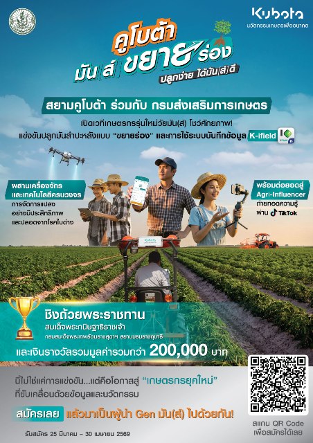 กรุงเทพฯ 1 เมษายน 2569 – บริษัทสยามคูโบต้าคอร์ปอเรชั่น จำกัด ร่วมกับ กรมส่งเสริมการเกษตร เปิดตัวกิจกรรม “คูโบต้า มัน(ส์) ขยายร่อง” ภายใต้คอนเซ็ปต์ “ปลูกง่าย ได้มัน(ส์)ดี” เวทีแข่งขันสำหรับเกษตรกรรุ่นใหม่ที่มุ่งยกระดับทักษะและศักยภาพการทำเกษตรยุคใหม่ผ่านการแข่งขันปลูกมันสำปะหลังแบบ “ขยายร่อง” ควบคู่กับการใช้ระบบบริหารจัดการข้อมูล K-iField ที่ช่วยเพิ่มประสิทธิภาพการเพาะปลูก ลดต้นทุน และยกระดับผลผลิตอย่างเป็นรูปธรรม ผสานการใช้เครื่องจักรกลการเกษตรรุ่น B Series และเทคโนโลยีครบวงจร เพื่อการจัดการแปลงอย่างมีประสิทธิภาพและปลอดจากโรคใบด่าง