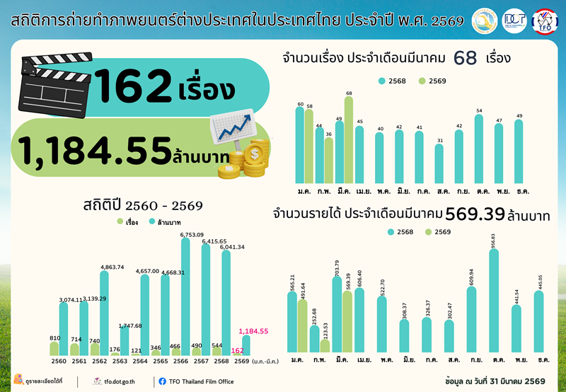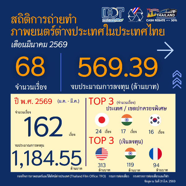เมื่อพิจารณาภาพรวมในช่วงไตรมาสแรกของปี 2569 (มกราคม–มีนาคม) มีกองถ่ายต่างประเทศเข้ามาถ่ายทำในประเทศไทยรวมทั้งสิ้น 162 เรื่อง คิดเป็นมูลค่าการลงทุนประมาณ 1,184 ล้านบาท สะท้อนให้เห็นถึงความเชื่อมั่นของผู้ผลิตภาพยนตร์และสื่อจากทั่วโลกที่ยังคงเลือกประเทศไทยเป็นจุดหมายสำคัญในการถ่ายทำ