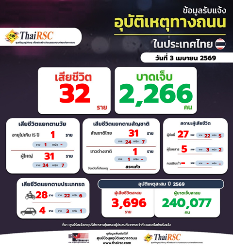 สถานการณ์อุบัติเหตุทางถนนในประเทศไทย วันที่ 3 เม.ย.69