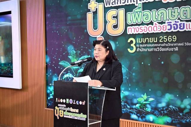 วันที่ 3 เมษายน 2569 สำนักงานการวิจัยแห่งชาติ(วช.) กระทรวงการอุดมศึกษา วิทยาศาสตร์ วิจัยและนวัตกรรม จัดงานแถลงข่าว “พลิกวิกฤตเป็นโอกาส ปุ๋ยเพื่อเกษตรกรไทย ทางรอดด้วยวิจัยและนวัตกรรม” โดย ดร.วิภารัตน์ ดีอ่อง ผู้อำนวยการสำนักงานการวิจัยแห่งชาติ เป็นประธานการแถลงข่าว พร้อมด้วยนักวิจัย ผู้เชี่ยวชาญ และหน่วยงานเครือข่ายเข้าร่วมนำเสนอนวัตกรรม ภายในงานมีการนำเสนอผลงานวิจัยและนวัตกรรมด้านปุ๋ยและการปรับปรุงดิน เพื่อเป็นทางเลือกใหม่ให้เกษตรกรไทยสามารถลดต้นทุนการผลิต และเพิ่มประสิทธิภาพการเกษตร ณ ศูนย์ส่งเสริมการวิจัยเพื่อมรดกทางวัฒนธรรม วช.