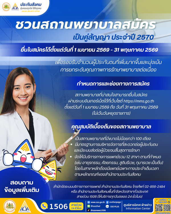 นางสาวกาญจนา พูลแก้ว เลขาธิการสำนักงานประกันสังคม กล่าวถึง การเปิดรับสมัครสถานพยาบาลเข้าร่วมเป็นสถานพยาบาลคู่สัญญาเพื่อให้บริการทางการแพทย์แก่ผู้ประกันตน ประจำปี 2570 เพื่อรองรับจำนวนผู้ประกันตนที่เพิ่มมากขึ้นในแต่ละปี และเป็นการกระตุ้นให้สถานพยาบาลเกิดการแข่งขันด้านการให้บริการและคุณภาพในการรักษาพยาบาลแก่ผู้ประกันตน โดยสถานพยาบาลที่มีความประสงค์เข้าร่วมเป็นสถานพยาบาลคู่สัญญากับสำนักงานประกันสังคม สามารถยื่นความประสงค์ผ่านระบบอิเล็กทรอนิกส์ผ่านเว็บไซต์ https://mms.sso.go.th ตั้งแต่บัดนี้ถึง 31 พฤษภาคม 2569