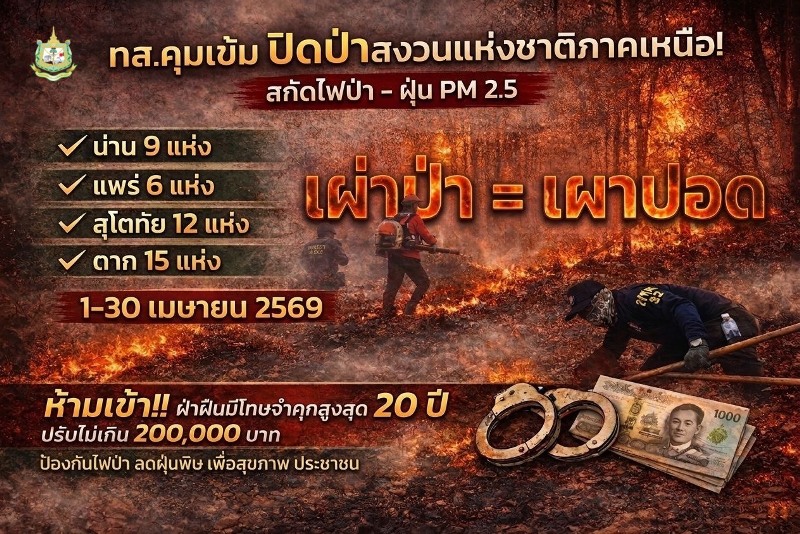 นายสุชาติ ชมกลิ่น รัฐมนตรีว่าการกระทรวงทรัพยากรธรรมชาติและสิ่งแวดล้อม สั่งการด่วนให้ทุกหน่วยงานในสังกัดยกระดับมาตรการเฝ้าระวังพื้นที่ป่าอย่างเข้มข้นในช่วงฤดูแล้ง เพื่อเร่งสกัดวิกฤตฝุ่น PM 2.5 และไฟป่าในพื้นที่ภาคเหนืออย่างเต็มกำลัง โดยล่าสุดจังหวัดน่าน แพร่ สุโขทัย ตาก ได้ขานรับนโยบายเชิงรุกดังกล่าว ออกประกาศคำสั่งปิดป่าสงวนแห่งชาติในพื้นที่ภาคเหนือ กว่า 42 ป่า รวม 4 จังหวัด ประกอบด้วย จังหวัดน่าน จำนวน 9 แห่ง จังหวัดแพร่ จำนวน 6 แห่ง จังหวัดสุโขทัย จำนวน 12 แห่ง จังหวัดตาก จำนวน 15 แห่ง โดยห้ามบุคคลเข้าพื้นที่โดยเด็ดขาด ตั้งแต่วันที่ 1–30 เมษายน 2569 ซึ่งหากพบผู้ใดฝ่าฝืนลักลอบเข้าพื้นที่หรือกระทำการเผาป่า จะต้องระวางโทษจำคุกสูงสุดถึง 20 ปี และปรับไม่เกิน 200,000 บาท ตามฐานความผิดที่บัญญัติไว้ในกฎหมายป่าไม้ ทั้งนี้ เพื่อตัดวงจรการเกิดไฟป่าจากน้ำมือมนุษย์และลดการสะสมของฝุ่นควันในชั้นบรรยากาศที่ส่งผลกระทบต่อสุขภาพของประชาชน