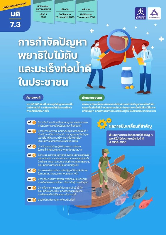 นพ.สุเทพ เพชรมาก เลขาธิการคณะกรรมการสุขภาพแห่งชาติ กล่าวว่า สมัชชาสุขภาพแห่งชาติ ได้มีมติ ขับเคลื่อนการกำจัดปัญหาพยาธิใบไม้ตับและมะเร็งท่อน้ำดี ในประชาชนอย่างต่อเนื่อง โดยตั้งเป้าหมายผู้ติดเชื้อเป็นศูนย์ เน้นการสร้าง “นักสื่อสารเพื่อการเปลี่ยนแปลง” และผลงานนวัตกรรมที่: กระตุ้นการปรับเปลี่ยนพฤติกรรม: ทำให้การกินแบบปรุงสุก กลายเป็นวิถีใหม่ สร้างความตื่นตัวในเด็กและเยาวชน ผ่านมาตรการเชิงรุก ทั้งเรื่องการรณรงค์ให้กลุ่มเสี่ยงเข้าตรวจด้วยชุดตรวจ OV-ATK การสร้างฐานข้อมูลกลุ่มเสี่ยง รวมถึงสร้างการมีส่วนร่วมทางดิจิทัล: ผ่านแคมเปญที่สนุก เข้าถึงง่าย และทรงพลังในโลกออนไลน์ โดยผนึกกำลังระดับพื้นที่ ร่วมกับ มหาวิทยาลัยขอนแก่น สช. สสส. สวรส. ภาคีเครือข่ายต้านมะเร็งท่อน้ำดี เพื่อลดอุบัติการณ์ของโรคในภาคเหนือและอีสาน