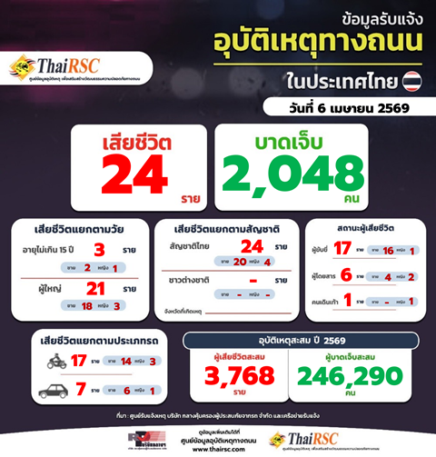 สถานการณ์อุบัติเหตุทางถนนในประเทศไทย วันที่ 6 เม.ย.69 7 เมษายน 2026Thailandplusประชาสัมพันธ์ Facebook iconFacebookTwitter iconTwitterLINE iconLineสถานการณ์อุบัติเหตุทางถนนในประเทศไทย วันที่ 6 เม.ย.69