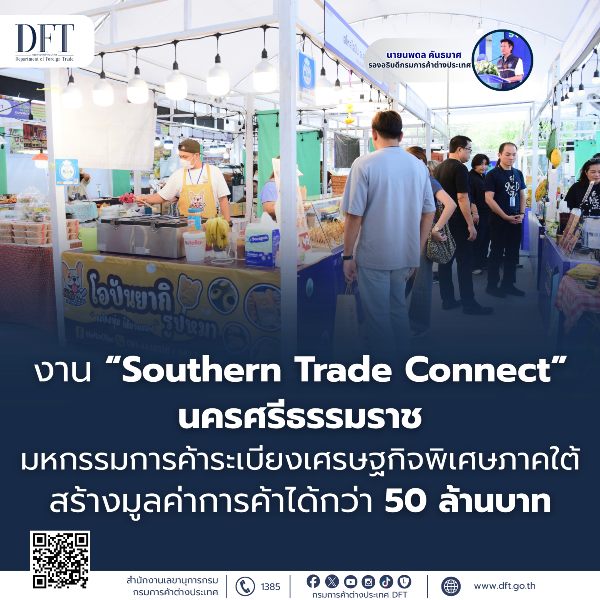 กรมการค้าต่างประเทศ กระทรวงพาณิชย์ รายงานผลความสำเร็จของการจัดงาน มหกรรมการค้าระเบียงเศรษฐกิจพิเศษภาคใต้ Southern Trade Connect ซึ่งจัดขึ้นระหว่างวันที่ 26 – 29 มีนาคม 2569 ณ ลานหน้าเซ็นทรัลนครศรีธรรมราช จังหวัดนครศรีธรรมราช โดยตลอด 4 วันของการจัดงาน มีประชาชนและผู้ที่สนใจเข้าร่วมงานกว่า 15,000 คน แม้ภาพรวมเศรษฐกิจทั้งในและต่างประเทศจะมีความผันผวน แต่กิจกรรมภายในงานสามารถกระตุ้นการจับจ่ายใช้สอยและสร้างสีสันทางเศรษฐกิจให้กับพื้นที่จังหวัดนครศรีฯ ได้กว่า 50 ล้านบาท