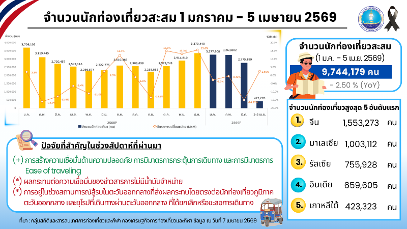 สรุปภาพรวมการท่องเที่ยวในสัปดาห์นี้ โดยข้อมูล ณ วันที่ 6 เม.ย. 69 พบว่า ประเทศไทยมีจำนวนนักท่องเที่ยวชาวต่างชาติสะสมตั้งแต่วันที่ 1 ม.ค. – 5 เม.ย. 69 ที่ผ่านมาทั้งสิ้น 9,744,179 คน สร้างรายได้จากการใช้จ่ายของนักท่องเที่ยวต่างชาติแล้วประมาณ 474,400 ล้านบาท โดยจำนวนนักท่องเที่ยวสูงสุด 5 อันดับแรก ได้แก่ จีน (1,553,273 คน) มาเลเซีย (1,003,112 คน) รัสเซีย (755,928 คน) อินเดีย (659,605 คน) และเกาหลีใต้ (423,323 คน)