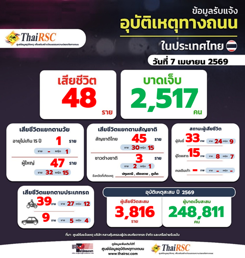 สถานการณ์อุบัติเหตุทางถนนในประเทศไทย วันที่ 7 เม.ย.69 8 เมษายน 2026Thailandplusประชาสัมพันธ์ Facebook iconFacebookTwitter iconTwitterLINE iconLine สถานการณ์อุบัติเหตุทางถนนในประเทศไทย วันที่ 7 เม.ย.69
