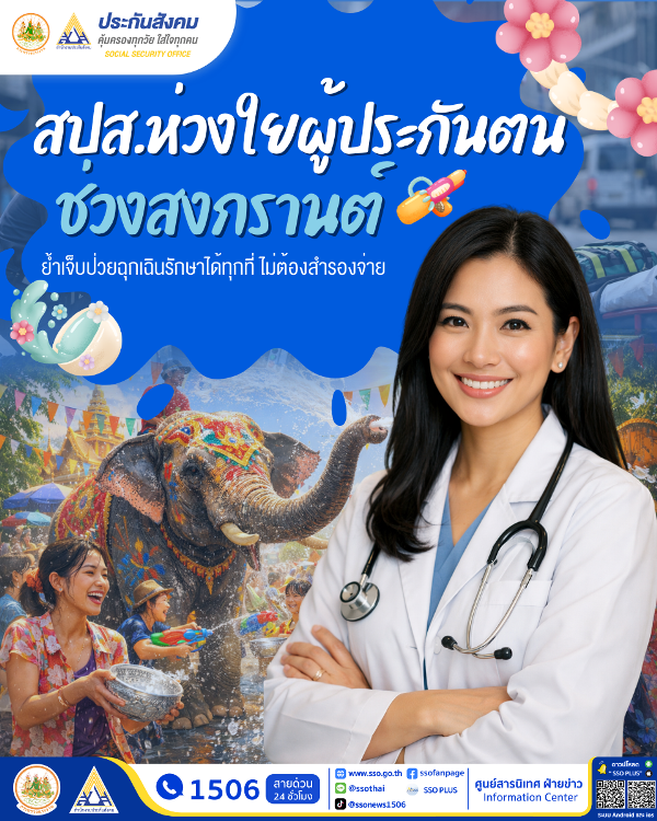 สำนักงานประกันสังคมแสดงความห่วงใยพี่น้องลูกจ้างผู้ประกันตนในช่วงเทศกาลสงกรานต์ ซึ่งมีวันหยุดราชการติดต่อกันหลายวัน และคาดว่าจะมีผู้ประกันตนจำนวนมากเดินทางกลับภูมิลำเนาหรือท่องเที่ยวในช่วงเวลาดังกล่าว