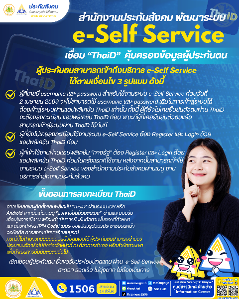 1. ผู้ที่เคยมี username และ password สำหรับใช้งานระบบ e-Self Service ก่อนวันที่ 2 เมษายน 2569 จะไม่สามารถใช้ username และ password เดิมในการเข้าสู่ระบบได้ ต้องเข้าสู่ระบบผ่านแอปพลิเคชัน ThaiD เท่านั้น ทั้งนี้ ผู้ที่ยังไม่เคยยืนยันตัวตนผ่าน ThaiD จะต้องลงทะเบียน แอปพลิเคชัน ThaiD ก่อน ขณะที่ผู้ที่เคยยืนยันตัวตนแล้ว สามารถเข้าสู่ระบบผ่าน ThaiD ได้ทันที