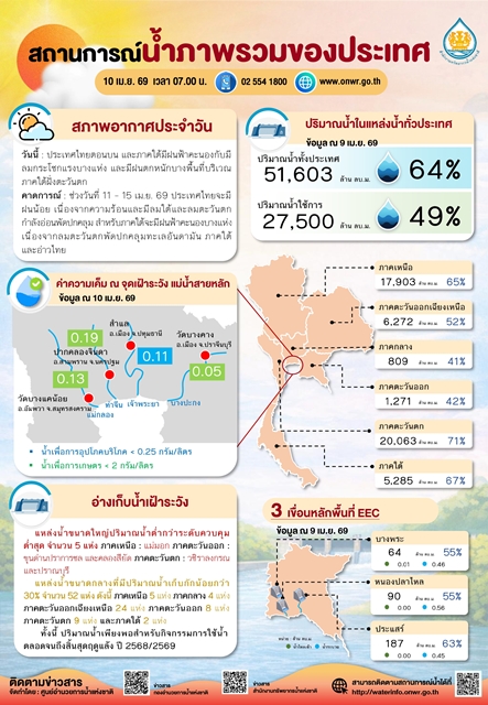 2. สถานการณ์น้ำอ่างเก็บน้ำในภาพรวม: ปริมาณน้ำรวม: 64% ของความจุเก็บกัก (51,603 ล้าน ลบ.ม.) ปริมาณน้ำใช้การ: 49% (27,500 ล้าน ลบ.ม.)