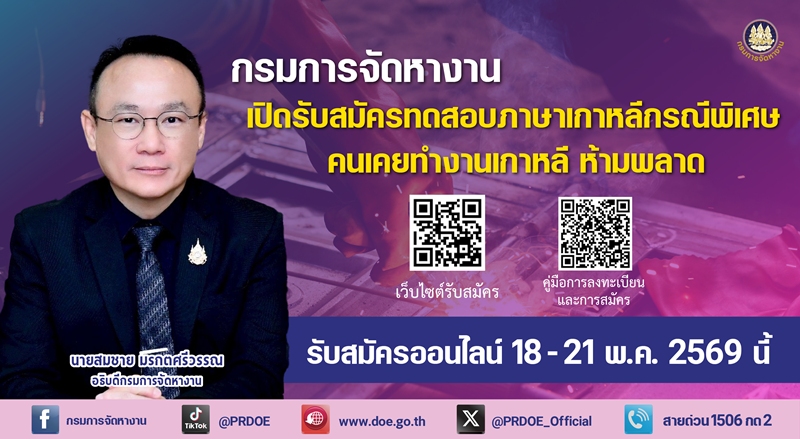 นายสมชาย มรกตศรีวรรณ อธิบดีกรมการจัดหางาน เปิดเผยว่า กรมการจัดหางานเปิดรับสมัครทดสอบภาษาเกาหลีกรณีพิเศษ (Special EPS-TOPIK) ครั้งที่ 30 สำหรับผู้ที่เคยเดินทางไปทำงานในสาธารณรัฐเกาหลีที่ถูกต้องตามกฎหมาย ซึ่งได้เดินทางกลับประเทศไทยภายในระยะเวลาที่กำหนด โดยต้องเป็นผู้ที่เดินทางกลับตั้งแต่วันที่ 1 มกราคม 2553 ถึงปัจจุบัน และมีความประสงค์จะเดินทางกลับไปทำงานในสาธารณรัฐเกาหลีอีกครั้งตามระบบ EPS ผู้สนใจสามารถยื่นใบสมัครได้ที่เว็บไซต์ toea.doe.go.th ได้ตั้งแต่วันที่ 18 – 21 พฤษภาคม 2569 ตลอด 24 ชั่วโมง