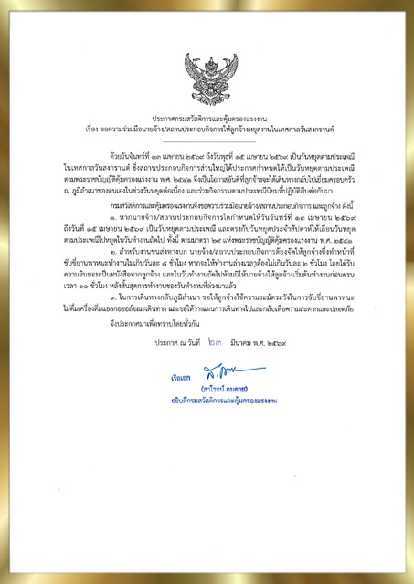 “ขอให้เทศกาลสงกรานต์นี้เป็นช่วงเวลาแห่งความสุขของแรงงานทุกท่าน ได้พักผ่อนอย่างเต็มที่ และเดินทางกลับมาทำงานด้วยความปลอดภัยครับ” อธิบดี กสร. กล่าวทิ้งท้าย