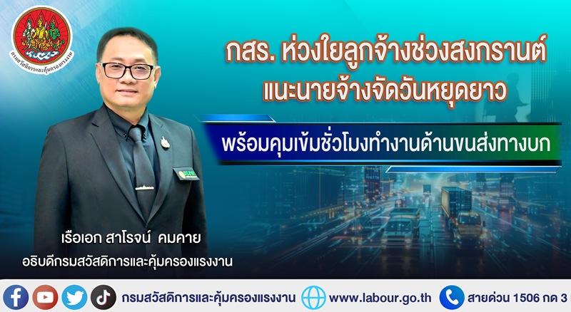 กสร. ห่วงใยลูกจ้างช่วงสงกรานต์ แนะนายจ้างจัดวันหยุดยาว พร้อมคุมเข้มชั่วโมงทำงานด้านขนส่งทางบก