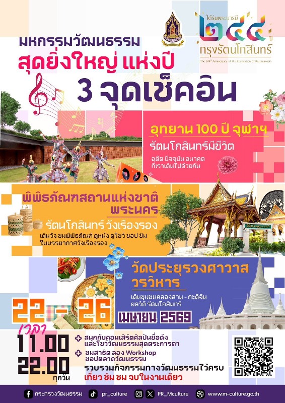 วธ. ชวนเเต่ง “ชุดไทย” ไปร่วมฉลอง “งานใต้ร่มพระบารมี 244 ปี กรุงรัตนโกสินทร์” 5 วันเต็ม หนุนภูมิใจแต่งไทยทั้งแผ่นดินต่อเนื่อง ทั้งเเต่งชุดไทยแบบดั้งเดิม ชุดไทยประยุกต์ หรือผ้าไทยในสไตล์ตัวเอง อวดสายตาชาวโลก พร้อมยกขบวนโขน – การแสดงพื้นบ้าน – ร่วมสมัย ศิลปินดัง 22 – 26 เมษายน 2569 นี้ บน 3 พื้นที่กลางกรุง ดูคอนเสิร์ตศิลปินดารารุ่นใหม่ที่อุทยาน 100 ปี จุฬาลงกรณ์มหาวิทยาลัย ,เดินวัง ชมพิพิธภัณฑ์ ดูหนัง ดูโชว์ ช้อป ชิมที่ พิพิธภัณฑสถานแห่งชาติ พระนคร และย้อนดูลิเก ทำคอนเทนต์งานวัดเก๋ๆ ที่วัดประยุรวงศาวาสวรวิหาร ร่วมสืบสาน – ต่อยอด มรดกวัฒนธรรมสู่ประชาชน นักท่องเที่ยวชาวไทย เเละชาวต่างประเทศอย่างยิ่งใหญ่