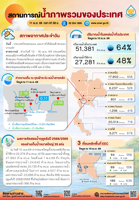 ณ วันที่ 10 เม.ย.69 อ่างฯขนาดใหญ่ทั้งประเทศมีปริมาณน้ำใช้การ 22,379 ล้าน ลบ.ม. (47%) แผนการระบายน้ำทั้งฤดู 27,862 ล้าน ลบ.ม. โดยตั้งแต่ 1 พ.ย.68 ถึง ปัจจุบัน มีแผนการระบายน้ำ 24,642 ล้าน ลบ.ม. โดยแบ่งเป็น แผนจัดสรรน้ำสะสม 20,135 ล้าน ลบ.ม. และแผนระบายน้ำเพื่อควบคุมระดับน้ำในอ่างฯ สะสม 4,507 ล้าน ลบ.ม. ผลการระบายน้ำ 23,686 ล้าน ลบ.ม. คิดเป็น 85% ของแผนฤดูแล้งปี 2568/2569 ซึ่งปัจจุบันมีผลการระบายน้ำน้อยกว่าแผนการระบายน้ำ 956 ล้าน ลบ.ม.