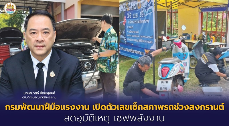 นายสมาสภ์ ปัทมะสุคนธ์ อธิบดีกรมพัฒนาฝีมือแรงงาน เปิดเผยว่า ในช่วงระหว่างวันที่ 3-9 เมษายน 2569 ที่ผ่านมา กรมพัฒนาฝีมือแรงงาน เปิดบริการตรวจเช็กสภาพรถยนต์และมอเตอร์ไซค์ฟรีในช่วงก่อนเทศกาลสงกรานต์ทั่วประเทศ เพื่อป้องกันและลดอุบัติเหตุทางถนนช่วงเวลาดังกล่าว ซึ่งดำเนินการบริการตรวจเช็กสภาพโดยเจ้าหน้าที่และผู้เข้ารับการฝึกอบรมของสถาบันพัฒนาฝีมือแรงงานและสำนักงานพัฒนาฝีมือแรงงาน โดยได้รับความสนใจจากประชาชนและแรงงานนำรถยนต์และมอเตอร์ไซค์เข้ารับบริการถึง 2,822 คัน ประกอบด้วย รถยนต์ 723 คัน และรถจักรยานยนต์ 2,099 คัน จังหวัดที่มีผู้ใช้บริการเป็นจำนวนมาก เช่น กรุงเทพมหานคร กระบี่ สงขลา สตูล ปัตตานี พะเยา สมุทรสงคราม ราชบุรี เป็นต้น ขอขอบคุณทุกหน่วยงานที่ให้บริการทำให้ความปลอดภัยบนท้องถนนมีมากขึ้น และที่สำคัญการตรวจเช็กสภาพรถยังมีส่วนช่วยลดการสูญเสียเชื้อเพลิงพลังงานน้ำมันภายในรถ ในยามวิกฤตขาดแคลนพลังงานที่ประเทศกำลังเผชิญอยู่ในปัจจุบัน