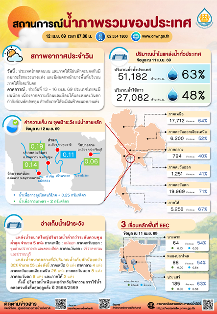 2. สถานการณ์น้ำอ่างเก็บน้ำในภาพรวม: ปริมาณน้ำรวม: 63% ของความจุเก็บกัก (51,182 ล้าน ลบ.ม.) ปริมาณน้ำใช้การ: 48% (27,082 ล้าน ลบ.ม.)