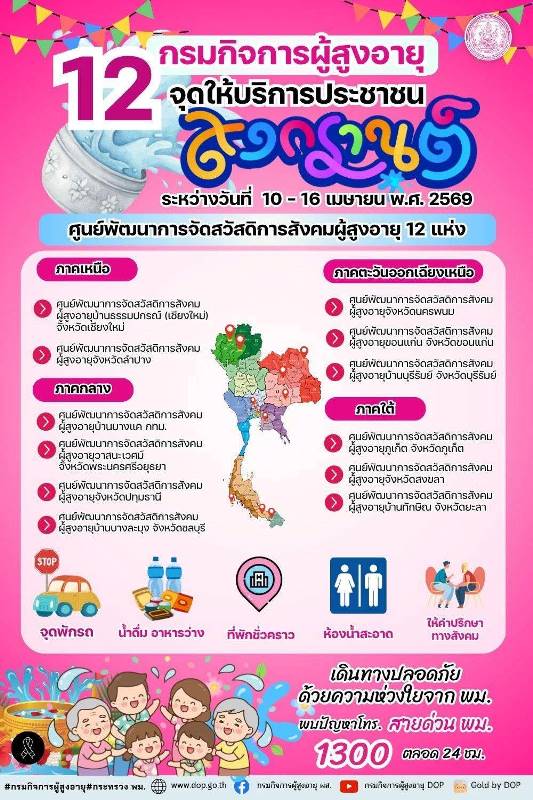 นายนิกร กล่าวว่า ทั้งนี้ กระทรวง พม. ได้เตรียมพร้อมในการดูแลและอำนวยความสะดวกแก่พี่น้องกลุ่มเปราะบางที่เป็นกลุ่มเป้าหมายของกระทรวง พม. อาทิ เด็ก เยาวชน ผู้สูงอายุ และคนพิการ รวมถึงประชาชนทั่วไป ให้มีความผ่อนคลาย เพื่อความปลอดภัยระหว่างการเดินทางกลับภูมิลำเนา โดยทีม พม. จังหวัดทั่วประเทศ ซึ่งตั้งอยู่บริเวณริมถนนสายหลักและถนนสายรอง ได้เปิดพื้นที่หน่วยงานต่างๆ ของกระทรวง พม. เป็นจุดพัก พม. บริการประชาชนในช่วงเทศกาลสงกรานต์ (ปีใหม่ไทย) 2569 ตั้งแต่วันนี้ – 19 เมษายน 2569 โดยให้บริการห้องน้ำคนพิการและผู้สูงอายุ , ที่พักรถชั่วคราว , มุมพักผ่อน , น้ำดื่ม , ชา , กาแฟ และ อาหารว่าง อีกทั้งการให้คำปรึกษาแนะนำในเรื่องสิทธิสวัสดิการสังคมต่าง ๆ ตามภารกิจกระทรวง พม.