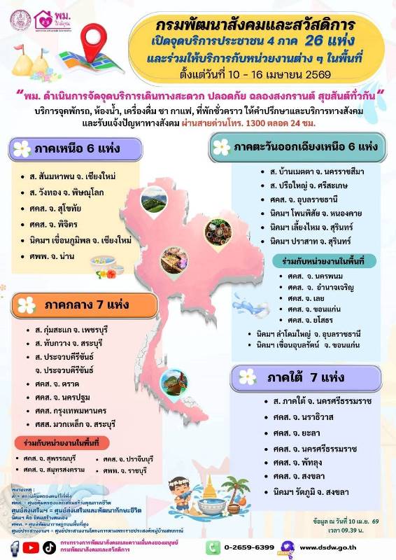 สำหรับหน่วยงาน ทีม พม. จังหวัดทั่วประเทศ ที่เปิดจุดพัก พม. บริการประชาชนในช่วงเทศกาลสงกรานต์ (ปีใหม่ไทย) 2569 ตั้งแต่วันนี้ – 19 เมษายน 2569 มีดังนี้