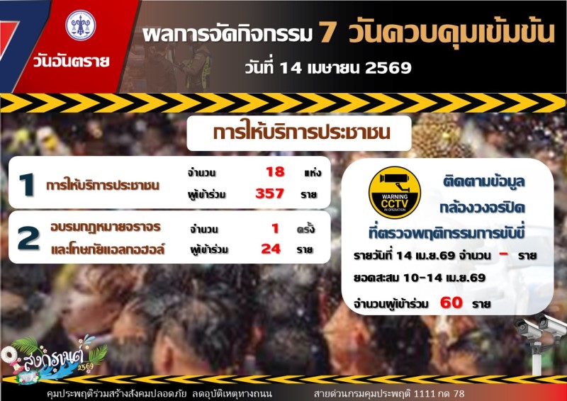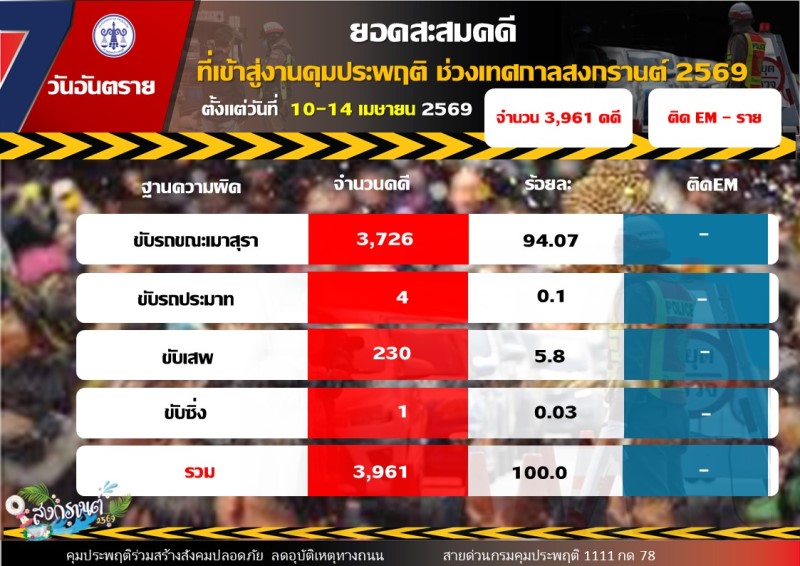 ขณะที่สถิติคดีสะสมช่วง 5 วัน (10 – 14 เมษายน 2569) มีจำนวนรวม 3,961 คดี โดยเป็นคดีขับรถขณะเมาสุรา 3,726 คดี คิดเป็นร้อยละ 94.07 คดีขับเสพ 230 คดี คิดเป็นร้อยละ 5.8 คดีขับรถประมาท 4 คดี คิดเป็นร้อยละ 0.1 และคดีขับซิ่ง 1 คดี คิดเป็นร้อยละ 0.03
