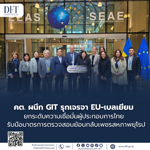 กรมการค้าต่างประเทศ (คต.) ร่วมกับสถาบันวิจัยและพัฒนาอัญมณีและเครื่องประดับแห่งชาติ (องค์การมหาชน) (GIT) นำคณะผู้แทนไทยเยือนเบลเยียม เดินหน้าหารือเชิงรุกกับ 11 หน่วยงานหลัก เพื่อวางแนวทางสนับสนุนและสร้างความมั่นใจให้ผู้ประกอบการไทยในการปฏิบัติตามกฎระเบียบการค้าเพชรใหม่ของ EU และ G7 มุ่งรักษาความสามารถในการแข่งขันและลดอุปสรรคทางการค้าในตลาดโลก