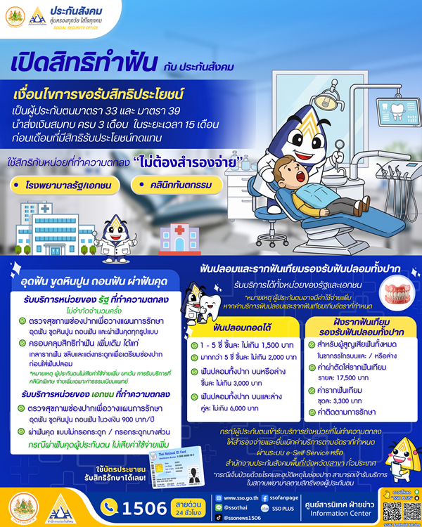 – ครอบคลุมบริการ อุดฟัน ขูดหินปูน ถอนฟัน วงเงิน 900 บาทต่อปี กรณีมีค่าใช้จ่ายเกิน 900 บาท ผู้ประกันตนต้องชำระส่วนต่างเอง