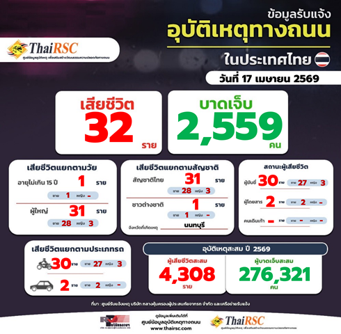 สถานการณ์อุบัติเหตุทางถนนในประเทศไทย วันที่ 10 เม.ย.69 18 เมษายน 2026Thailandplusประชาสัมพันธ์ Facebook iconFacebookTwitter iconTwitterLINE iconLineสถานการณ์อุบัติเหตุทางถนนในประเทศไทย วันที่ 10 เม.ย.69