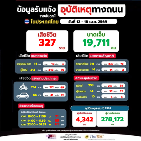 สถานการณ์อุบัติเหตุทางถนนในประเทศไทย รายสัปดาห์วันที่ 12-18 เม.ย.69 19 เมษายน 202619 เมษายน 2026Thailandplusประชาสัมพันธ์ Facebook iconFacebookTwitter iconTwitterLINE iconLineสถานการณ์อุบัติเหตุทางถนนในประเทศไทย วันที่ 18 เม.ย.69