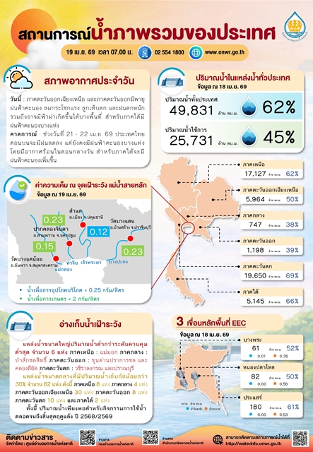สรุปสถานการณ์น้ำภาพรวมของประเทศ วันที่ 19 เม.ย. 69 เวลา 7.00 น.