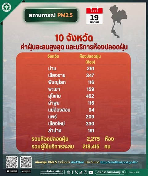 วันที่ 19 เมษายน 2569 นพ.เอกชัย เพียรศรีวัชรา รองปลัดกระทรวงสาธารณสุขและโฆษกกระทรวงสาธารณสุข กล่าวถึงการดูแลสุขภาพประชาชนในสถานการณ์ฝุ่น PM 2.5 ที่ยังคงสูงอย่างต่อเนื่อง ว่า นายพัฒนา พร้อมพัฒน์ รัฐมนตรีว่าการกระทรวงสาธารณสุข และ นพ.สมฤกษ์ จึงสมาน ปลัดกระทรวงสาธารณสุข ได้มอบนโยบายและติดตามการทำงานด้านสาธารณสุขทุกพื้นที่อย่างต่อเนื่อง เพื่อดูแลสุขภาพประชาชนจากฝุ่น PM 2.5 โดยให้ตั้งศูนย์ปฏิบัติการฉุกเฉินด้านการแพทย์และสาธารณสุข (PHEOC) กรณีฝุ่น PM 2.5 เพื่อติดตามสถานการณ์คุณภาพอากาศ และใช้เป็นข้อมูลในการแจ้งเตือนและดูแลสุขภาพประชาชนได้ทันทีในพื้นที่ที่มีค่าฝุ่นสูงและพื้นที่ที่มีแนวโน้มค่าฝุ่นจะสูงขึ้นจนถึงระดับเริ่มส่งผลกระทบต่อสุขภาพ โดยเฉพาะภาคเหนือที่มีค่าฝุ่นเกินมาตรฐานอย่างต่อเนื่อง รวมถึงมีการเฝ้าระวัง 4 กลุ่มโรคสำคัญ เพื่อติดตามผลกระทบในระยะยาว ซึ่งข้อมูลวันที่ 19 เมษายน 2569 พบว่า 10 จังหวัดที่มีค่าฝุ่น PM 2.5 สะสมสูงสุด ได้แก่ น่าน 210.9 ไมโครกรัมต่อลูกบาศก์เมตร (มคก./ลบ.ม.) เชียงราย 152.9 มคก./ลบ.ม. พิษณุโลก 129.9 มคก./ลบ.ม. พะเยา 129.2 มคก./ลบ.ม. สุโขทัย 113.0 มคก./ลบ.ม. ลำพูน 109.0 มคก./ลบ.ม. แม่ฮ่องสอน 108.0 มคก./ลบ.ม. แพร่ 99.9 มคก./ลบ.ม. เชียงใหม่ 99.1 มคก./ลบ.ม. และลำปาง 98.4 มคก./ลบ.ม.