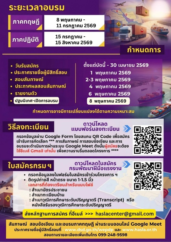 อธิบดีสมาสภ์ กล่าวเพิ่มเติมว่า ผู้เข้ารับการฝึกอบรมจะได้รับความรู้เกี่ยวกับการจัดการสินค้าอันตรายตามมาตรฐานสากล ADR การบริหารจัดการโลจิสติกส์สีเขียว (Green Logistics) มาตรฐานการขนส่ง Q-mark การประยุกต์ใช้ Smart Technology ในงานขนส่งสินค้าอันตราย ความปลอดภัย การจัดทำเอกสาร Safety Data Sheet (SDS) และกฎหมายการขนส่งข้ามแดน ซึ่งเป็นความรู้ที่จำเป็นในการทำงาน โดยเปิดรับสมัครเพียง 50 คนเท่านั้น ฟรี ไม่มีค่าใช้จ่าย มีอายุไม่เกิน 28 ปี จบการศึกษาระดับปริญญาตรีทุกสาขา หรือเป็นผู้ว่างงานไม่อยู่ระหว่างการศึกษาต่อ ทั้งนี้ การอบรมจัดในรูปแบบออนไลน์ผ่านระบบ Google Meet ภาคทฤษฎี ระหว่างวันที่ 8 พฤษภาคม – 11 กรกฎาคม 2569 และภาคปฏิบัติระหว่างวันที่ 15 กรกฎาคม – 15 สิงหาคม 2569 ในสถานประกอบกิจการ