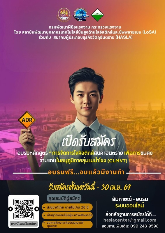 กรมพัฒนาฝีมือแรงงาน กระทรวงแรงงาน โดยสถาบันพัฒนาบุคลากรเทคโนโลยีชั้นสูงด้านโลจิสติกส์และซัพพลายเชน (LoSA) ผนึกกำลังสมาคมผู้ประกอบธุรกิจวัตถุอันตราย (HASLA) เปิดอบรมหลักสูตร “การจัดการโลจิสติกส์สินค้าอันตราย เพื่อการขนส่งข้ามแดนในอนุภูมิภาคลุ่มแม่น้ำโขง CLMVT” มุ่งพัฒนาทักษะแรงงานรองรับสายงานรายได้ดีที่ตลาดต้องการ
