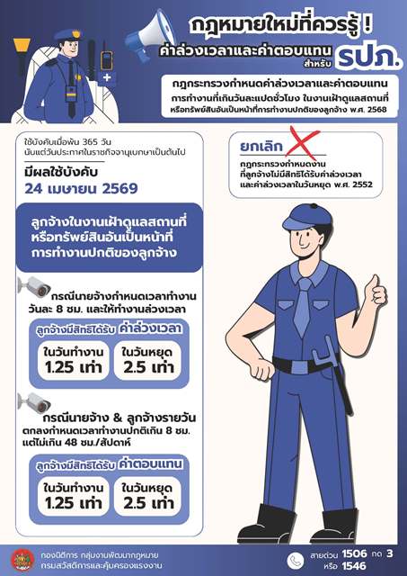 อธิบดี กสร. กล่าวต่อว่าสาระสำคัญของกฎกระทรวงดังกล่าว กำหนดให้นายจ้างที่มอบหมายให้ลูกจ้างในงานเฝ้าดูแลสถานที่หรือทรัพย์สินอันเป็นหน้าที่การทำงานปกติของลูกจ้าง (รปภ.) ทำงานล่วงเวลา มีหน้าที่ต้องจ่ายค่าล่วงเวลาตามอัตราที่กฎหมายกำหนด คือ ในวันทำงานปกติจ่ายค่าล่วงเวลาในอัตราไม่น้อยกว่า 1.25 เท่า ของอัตราค่าจ้างต่อชั่วโมงในวันทำงาน และในวันหยุดจ่ายค่าล่วงเวลาในอัตราไม่น้อยกว่า 2.5 เท่าของอัตราค่าจ้างต่อชั่วโมงในวันทำงาน และในกรณีที่ลูกจ้างในงานเฝ้าดูแลสถานที่หรือทรัพย์สินอันเป็นหน้าที่การทำงานปกติของลูกจ้าง ซึ่งไม่ได้รับค่าจ้างเป็นรายเดือน นายจ้างและลูกจ้างอาจตกลงกันกำหนดเวลาทำงานปกติเกินกว่า 8 ชั่วโมงต่อวันก็ได้ แต่เมื่อรวมเวลาทำงานทั้งสัปดาห์แล้วต้องไม่เกิน 48 ชั่วโมง โดยนายจ้างมีหน้าที่จ่ายค่าตอบแทนสำหรับชั่วโมงที่เกินกว่า 8 ชั่วโมงแรก กล่าวคือ ในวันทำงานปกติ จ่ายเพิ่มในอัตราไม่น้อยกว่า 1.25 เท่าของอัตราค่าจ้างต่อชั่วโมง และค่าตอบแทนในวันหยุดจ่ายเพิ่มในอัตราไม่น้อยกว่า 2.5 เท่าของอัตราค่าจ้างต่อชั่วโมง ทั้งนี้ กฎกระทรวงฉบับดังกล่าวจะเริ่มมีผลบังคับใช้ตั้งแต่วันที่ 24 เมษายน พ.ศ. 2569 เป็นต้นไป