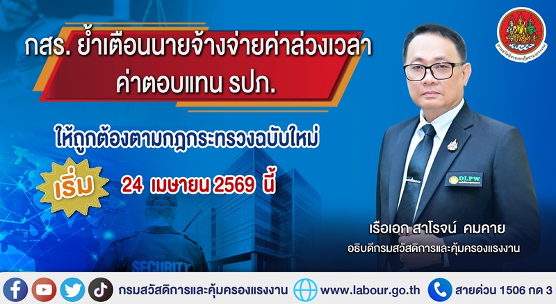 กสร. ย้ำเตือนนายจ้างจ่ายค่าล่วงเวลา/ค่าตอบแทน รปภ. ให้ถูกต้องตามกฎกระทรวงฉบับใหม่ เริ่ม 24 เมษายน 2569 นี้