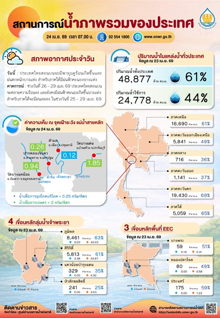 2. สถานการณ์น้ำอ่างเก็บน้ำในภาพรวม: ปริมาณน้ำรวม: 61% ของความจุเก็บกัก (48,877 ล้าน ลบ.ม.) ปริมาณน้ำใช้การ: 44% (24,778 ล้าน ลบ.ม.)