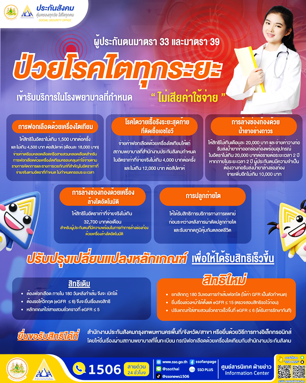 วันที่ 23 เมษายน 2569 นางสาวกาญจนา พูลแก้ว เลขาธิการสำนักงานประกันสังคม เปิดเผยว่าคณะกรรมการการแพทย์และคณะกรรมการประกันสังคม เห็นชอบปรับปรุงหลักเกณฑ์ทางการแพทย์ด้านการบำบัดทดแทนไต เพื่อให้ผู้ประกันตนสามารถเข้าถึงการรักษาได้รวดเร็ว เหมาะสมกับอาการ มีความยืดหยุ่นมากยิ่งขึ้น และผู้ประกันตนไม่ต้องสำรองจ่าย