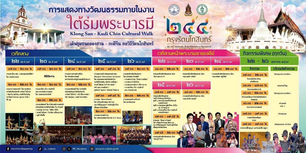 นางสาวซาบีดา ไทยเศรษฐ์ รัฐมนตรีว่าการกระทรวงวัฒนธรรม เปิดเผยว่า กระทรวงวัฒนธรรม (วธ.) ร่วมกับหน่วยงานรัฐ เอกชนและเครือข่ายทางศาสนา ศิลปะและวัฒนธรรม ได้เเก่ กรุงเทพมหานคร กระทรวงการท่องเที่ยวและกีฬา สำนักงานตำรวจแห่งชาติ กองบัญชาการตำรวจนครบาล กรมประชาสัมพันธ์ จุฬาลงกรณ์มหาวิทยาลัย การไฟฟ้านครหลวง มหาวิทยาลัยธรรมศาสตร์ มหาวิทยาลัยเทคโนโลยีราชมงคลพระนคร สมาคมส่งเสริมคอนเทนต์ วาย ไทย บริษัท แคนนอน มาร์เก็ตติ้ง (ไทยแลนด์) จำกัด บริษัท จีเอ็มเอ็ม แกรมมี่ จำกัด (มหาชน) บริษัท จีเอ็มเอ็มทีวี จำกัด บริษัท กันตนา กรุ๊ป จํากัด (มหาชน) บริษัท บรอดคาซท์ ไทย เทเลวิชั่น จำกัด และบริษัท ทีพีเอ็น โกลบอล จำกัด ผนึกกำลังจัดงาน “ใต้ร่มพระบารมี 244 ปี กรุงรัตนโกสินทร์” ขึ้น เพื่อร่วมเฉลิมฉลองเนื่องในวาระครบรอบวันคล้ายวันสถาปนากรุงรัตนโกสินทร์ 244 ปี และเพื่อน้อมรำลึกในพระมหากรุณาธิคุณและเทิดพระเกียรติพระบาทสมเด็จพระพุทธยอดฟ้าจุฬาโลกมหาราช ปฐมกษัตริย์แห่งพระบรมราชวงศ์จักรี ทรงสถาปนากรุงรัตนโกสินทร์เป็นราชธานีของไทย เมื่อวันที่ 21 เมษายน พ.ศ. 2325 นับถึงปัจจุบันเป็นเวลากว่า 244 ปี และพระมหากษัตริย์ไทยในพระบรมราชจักรีวงศ์ทุกพระองค์ทรงเปี่ยมด้วยทศพิธราชธรรม ทรงปฏิบัติพระราชกรณียกิจนานัปการเพื่อสร้างประเทศชาติให้มีความเป็นปึกแผ่นมั่นคงด้วยพระปรีชาสามารถและพระราชวิสัยทัศน์อันกว้างไกล ทรงทำนุบำรุงศาสนา ศิลปะและวัฒนธรรมของชาติให้เจริญรุ่งเรืองสืบมาถึงปัจจุบัน
