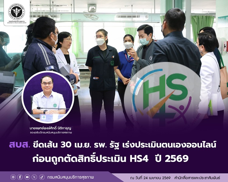 นายแพทย์พงษ์ศักดิ์ นิติการุญ รองอธิบดีกรม สบส. กล่าวว่า กรม สบส. ได้กำหนดมาตรฐานระบบบริการสุขภาพ HS4 (Health Standard Service Support System) ภายใต้พระราชบัญญัติสถานพยาบาล พ.ศ. 2541 และที่แก้ไขเพิ่มเติม โดยพระราชบัญญัติสถานพยาบาล (ฉบับที่ 4) พ.ศ. 2559 เพื่อเป็นมาตรฐานแห่งชาติในการประเมินมาตรฐานระบบบริการสุขภาพของสถานพยาบาลภาครัฐ ซึ่งการที่สถานพยาบาลมีการ ควบคุม มาตรฐานให้เป็นไปตามกฎหมายที่กำหนด ย่อมส่งผลให้บริการของสถานพยาบาลเป็นไปอย่างมีประสิทธิภาพ สร้างความปลอดภัยและสวัสดิภาพให้กับเจ้าหน้าที่ผู้ปฏิบัติงาน โดยในปีงบประมาณ พ.ศ. 2569 กรม สบส. ได้กำหนดให้สถานพยาบาลที่ต้องการประเมินมาตรฐาน HS4 ดำเนินการประเมินตนเองผ่านทางเว็บไซต์ HS4 (https://hs4.hss.moph.go.th/) ตั้งแต่เดือนพฤศจิกายน 2568 – เมษายน 2569 หากสถานพยาบาลใดมิได้ประเมินตนเองผ่านระบบภายในวันที่ 30 เมษายน 2569 จะถือว่าเสียสิทธิ์ในการประเมินมาตรฐานฯ ปี 2569 ทันที โดยสถานพยาบาลที่ประเมินตนเองผ่านระบบทันเวลา จะต้องส่งเอกสารแนบเพิ่มเติมภายในเดือนมิถุนายน 2569 เพื่อให้คณะกรรมการฯ ได้ทำการตรวจประเมิน และประกาศผลการตรวจประเมินภายในสิงหาคม – กันยายน 2569 ซึ่งสถานพยาบาลที่ผ่านการประเมินจะได้รับการรับรองมาตรฐาน HS4 เป็นระยะเวลา 3 ปี หลังจากนั้นต้องดำเนินการต่ออายุโดยผ่านกระบวนการประเมินใหม่ โดยโรงพยาบาลต้องยื่นเอกสารแสดงผลการพัฒนาคุณภาพต่อเนื่องล่วงหน้าอย่างน้อย 6 เดือนก่อนวันหมดอายุ