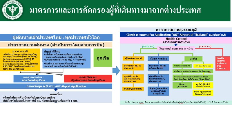ว่ากระทรวงสาธารณสุข ได้ร่วมกับหน่วยงานที่เกี่ยวข้อง เฝ้าระวังคัดกรอง ป้องกันควบคุมโรคในกลุ่มผู้เดินทางเข้าออกประเทศ ที่ด่านควบคุมโรคติดต่อระหว่างประเทศ 68 แห่งทั่วประเทศ ทั้งท่าอากาศยาน ท่าเรือ และด่านพรมแดนทางบก เพื่อลดความเสี่ยงโรคโควิด 19