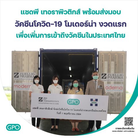 กรุงเทพฯ ประเทศไทย, 1 พฤศจิกายน 2564 – แซดพี เทอราพิวติกส์ (ZP Therapeutics) หน่วยธุรกิจภายใต้ ซิลลิค ฟาร์มา ผู้ให้บริการด้านการดูแลสุขภาพชั้นนำในเอเชีย พร้อมที่จะส่งมอบวัคซีนโควิด-19 โมเดอร์น่า งวดแรกจำนวน 560,000 โด๊ส ให้แก่องค์การเภสัชกรรม เพื่อจัดส่งวัคซีนให้แก่สมาคมโรงพยาบาลเอกชน ด้วยความมุ่งมั่นที่จะเพิ่มการเข้าถึงวัคซีนทางเลือกให้แก่ประชาชนชาวไทย