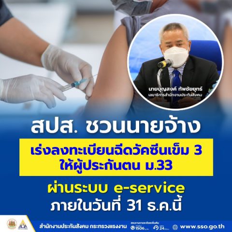 ทั้งนี้ เลขาธิการสำนักงานประกันสังคม ยังได้เน้นย้ำและเชิญชวนให้นายจ้างเร่งลงทะเบียนให้ลูกจ้างที่เป็นผู้ประกันตนเข้ารับการฉีดวัคซีนเข็ม 3 ผ่านระบบ e-Service ภายในวันที่ 31 ธันวาคม 2564 เพื่อป้องกันการแพร่ระบาด และควบคุมโรคด้วยการฉีดวัคซีนให้ครบถ้วน หากมีข้อสงสัยสามารถติดต่อสอบถามรายละเอียดเพิ่มเติมได้ที่สายด่วน 1506 ทุกวัน ตลอด 24 ชั่วโมง