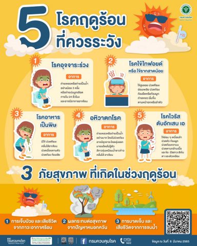 กรมควบคุมโรค กระทรวงสาธารณสุข ออกประกาศเตือนประชาชนในการป้องกันโรคและภัยสุขภาพในช่วงฤดูร้อน ประกอบด้วย 5 โรค และ 3 ภัยสุขภาพ ที่ประชาชนควรระมัดระวังการเจ็บป่วย พร้อมแนะดูแลสุขภาพตนเองและครอบครัวอย่างเคร่งครัด